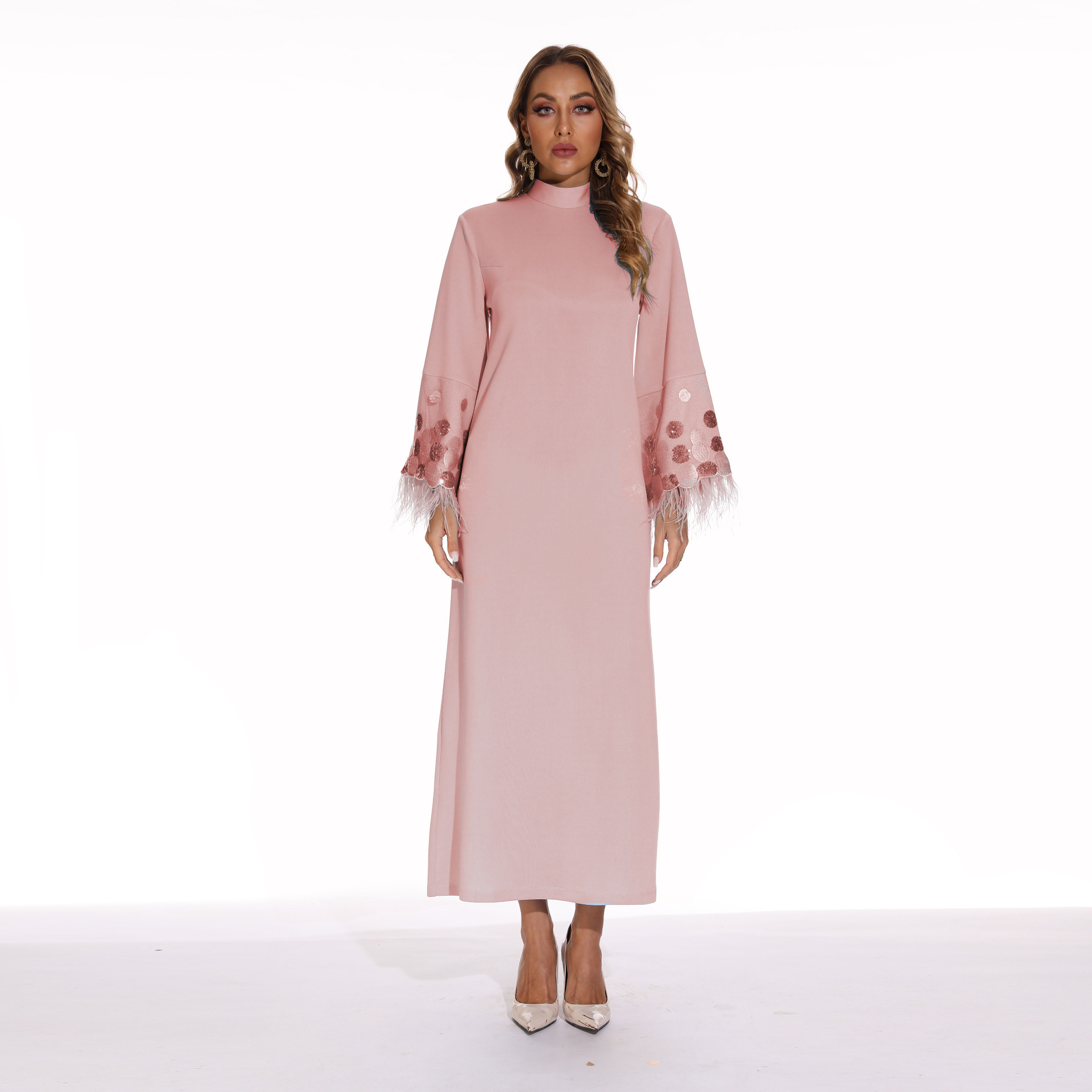 You are here: Home » Products » Abaya / Maxi Dress » 2022 Elegant Solid Color Middle East European And American Long Ethnic Style Round Neck Sequined Feather Sleeve Long Skirt