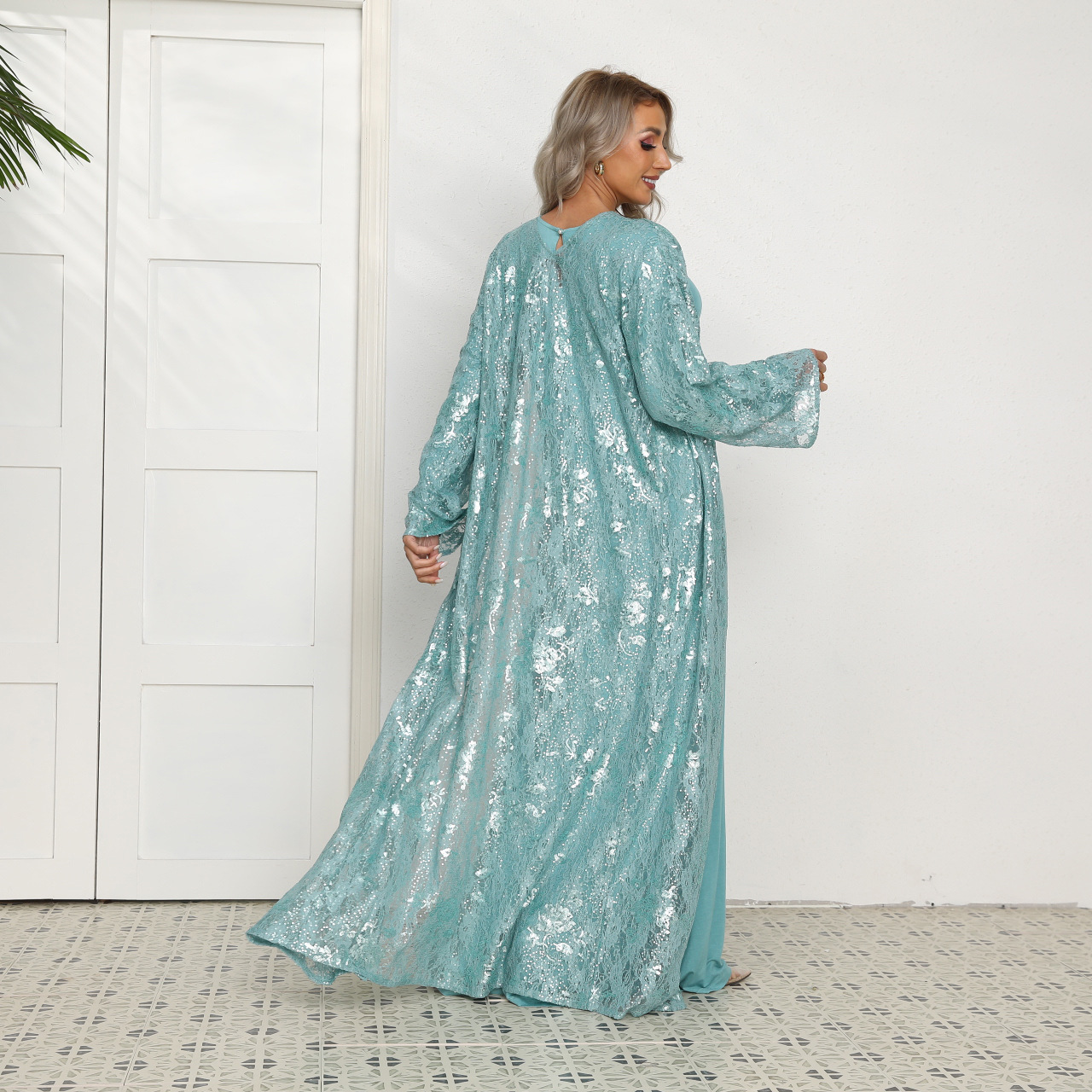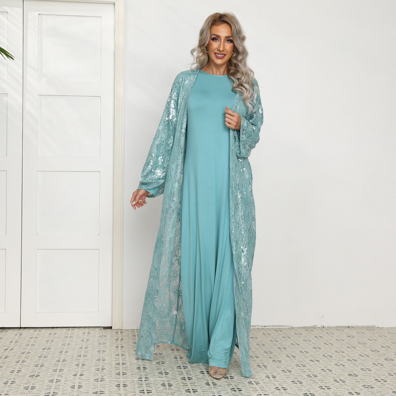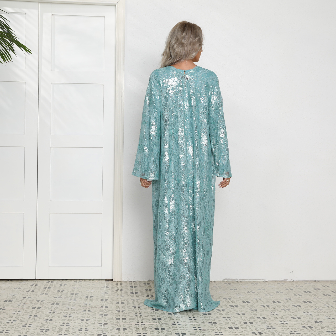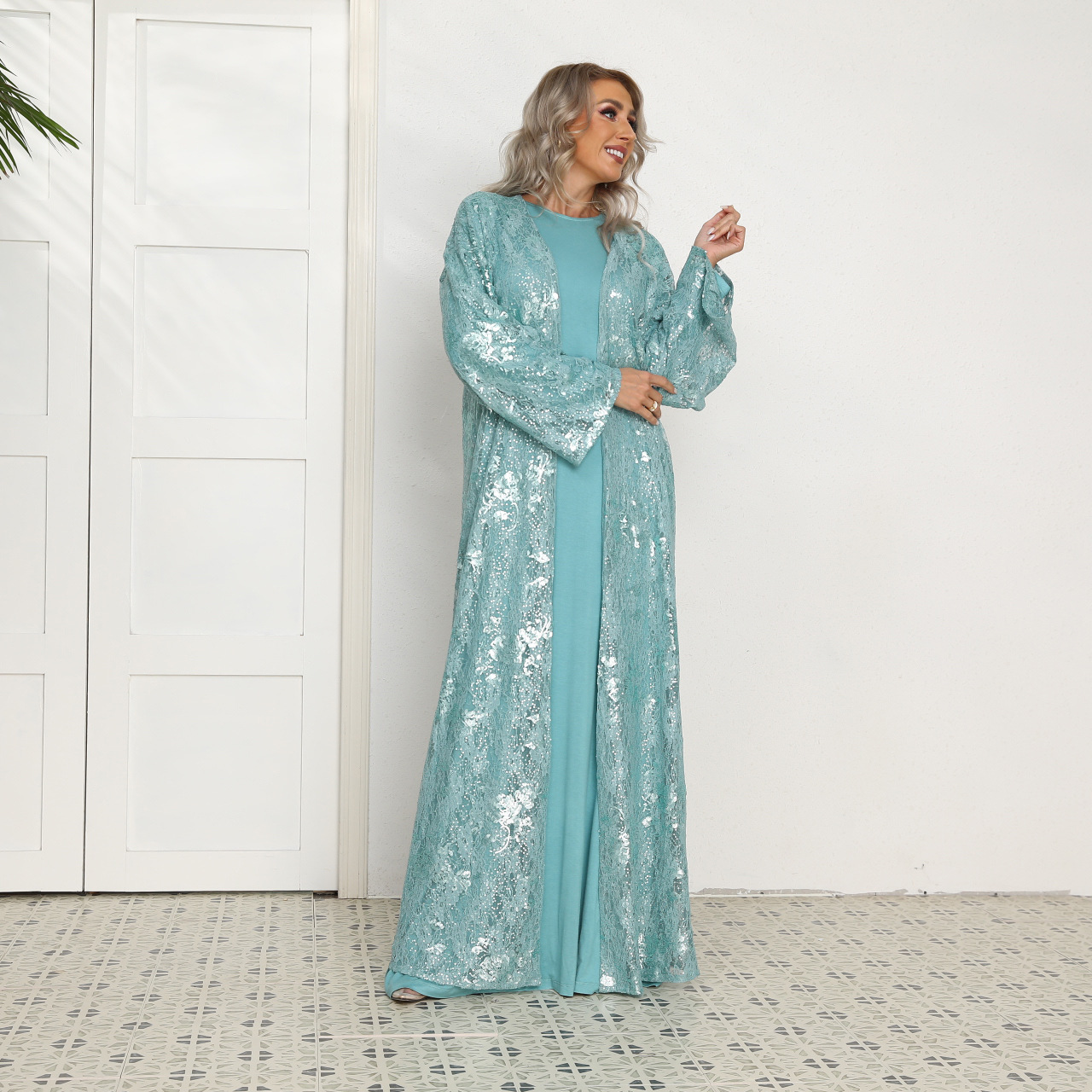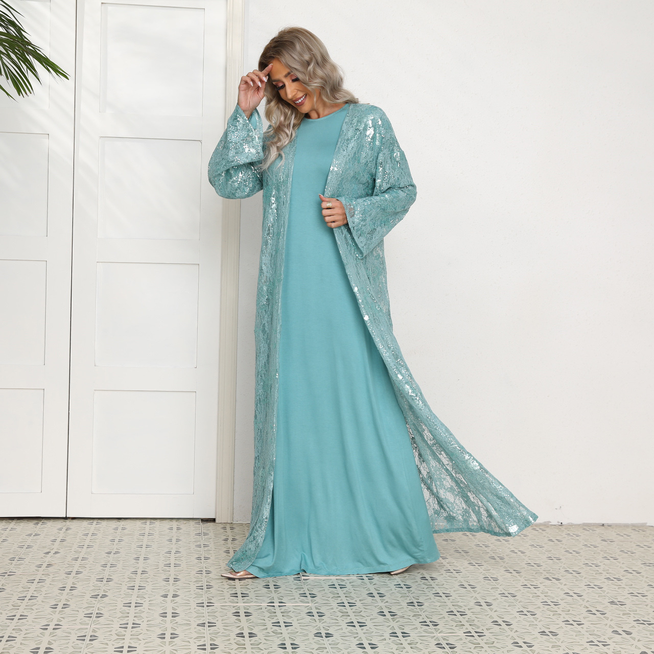 You are here:Home » Products » Abaya / Maxi Dress » 2022 Muslim Fashion Muslim Elegant Sequins Loose Large Size Lightweight See-through Blue Middle East Jacket