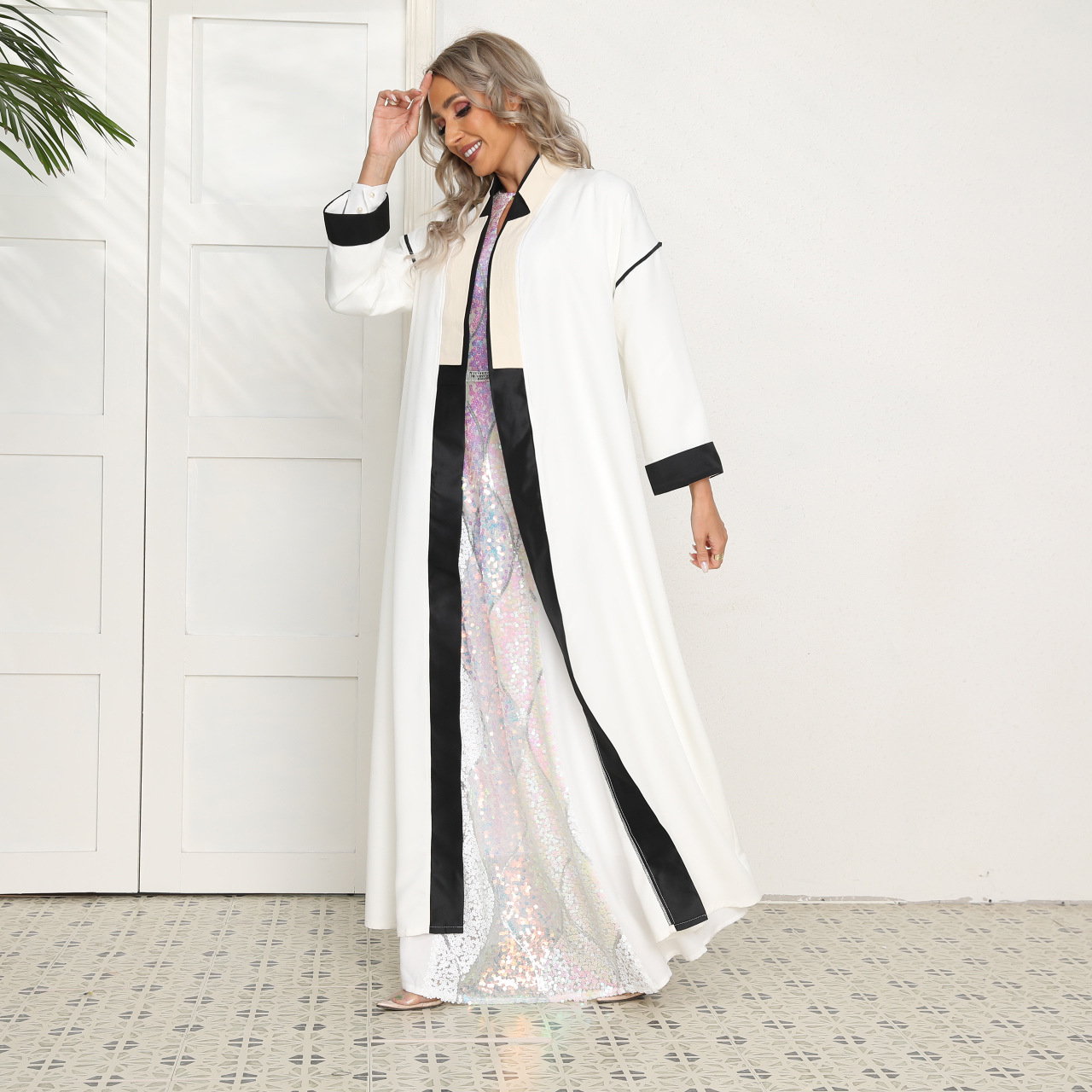 You are here: Home » Products » Abaya / Maxi Dress » 2022 Muslim New Southeast Asian Simple And Elegant Black And White Stitching Long-sleeved Muslim Conservative Jacket Abaya
