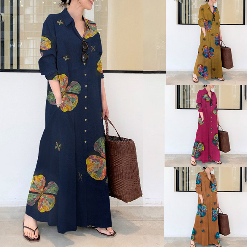 You are here:Home » Products » Abaya / Maxi Dress » 2022 Muslim Plus Size Women's Cotton And Linen Printing Lapel Long-sleeved Pockets Simple Loose Literary Leisure Long Shirt Dress