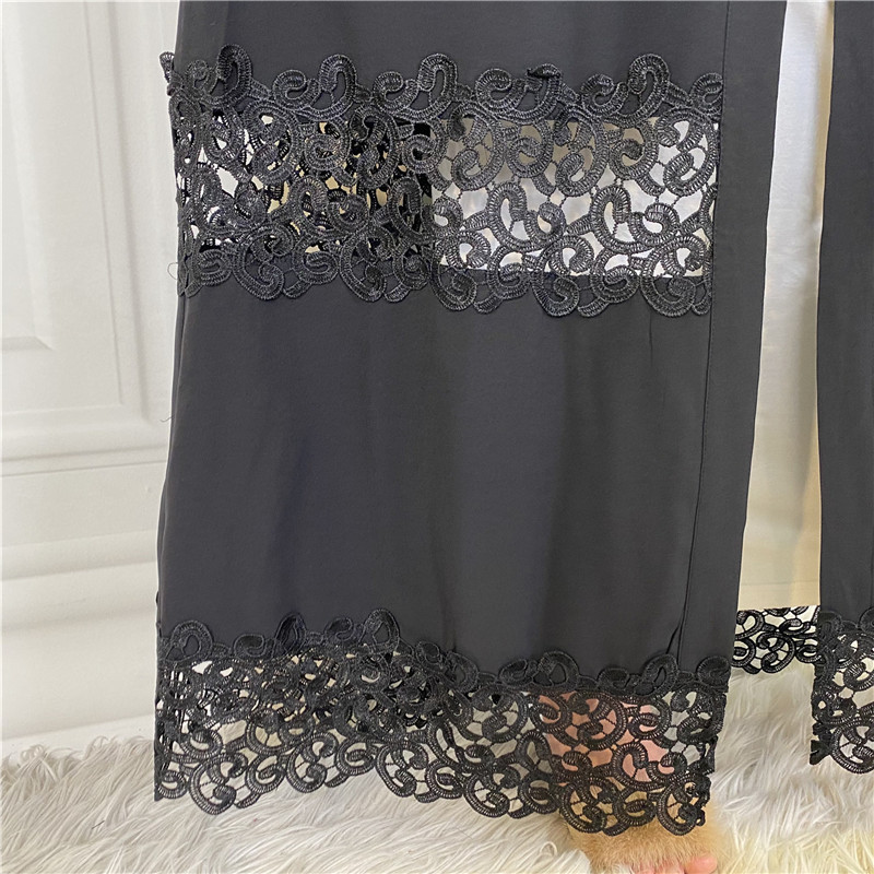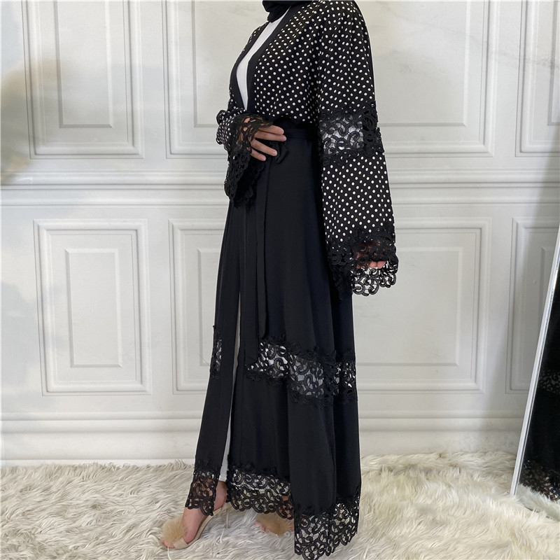 2022 New Fashion Black Lace Stitching Polka Dot Turkish Islamic Cardigan Muslim Abaya