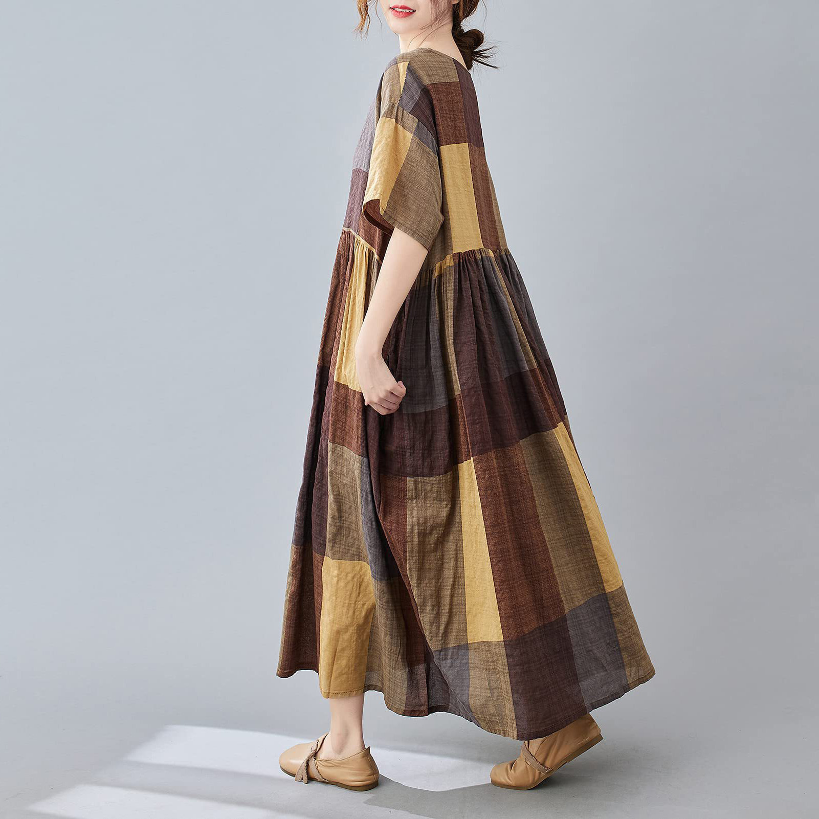 2022 Summer Check Pattern Plus Size Women's Retro Ethnic Style Clothes Casual Cotton Loose Big Swing Dress Long Skirt