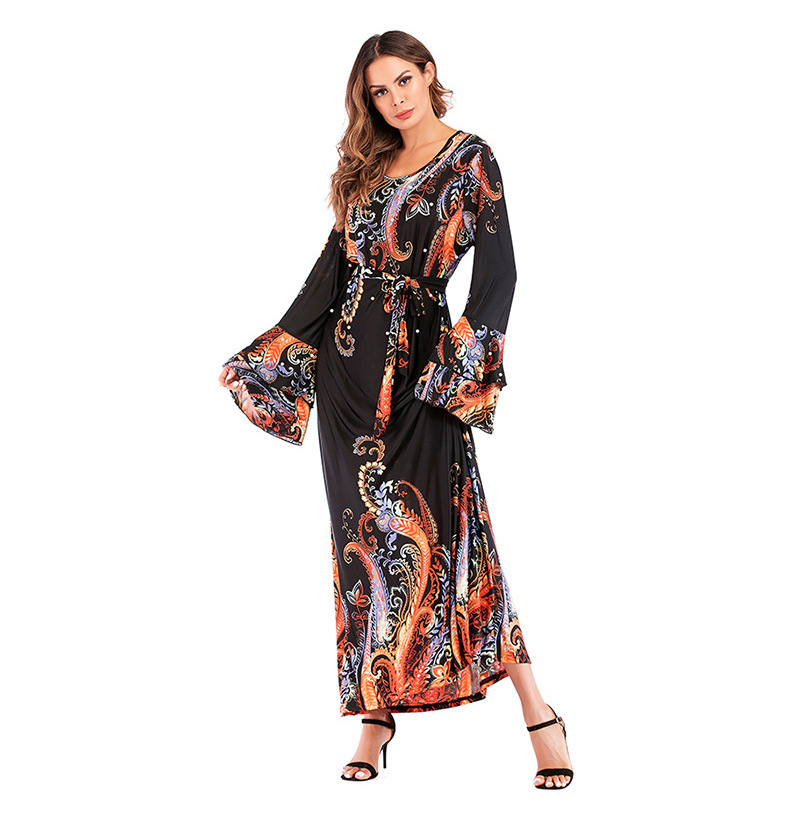 You are here:Home » Products » Abaya / Maxi Dress » Amazon AliExpress Hot Print Round Neck Pile Sleeves Beaded Ice Soft Silk Dress Long Dress