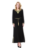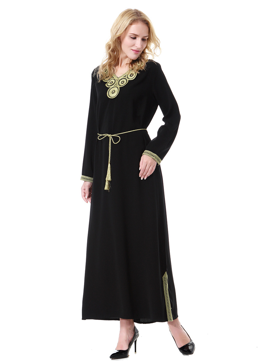 Black V-Neck Applique Breathable Long Sleeve Solid Muslim Islamic Women Abaya Dress Clothing