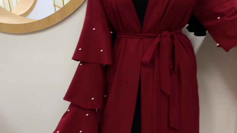 You are here:Home » Products » Abaya / Maxi Dress » European And American Muslim Fashion Beaded Multi-layer Flared Sleeves with Solid Color Cardigan Robe