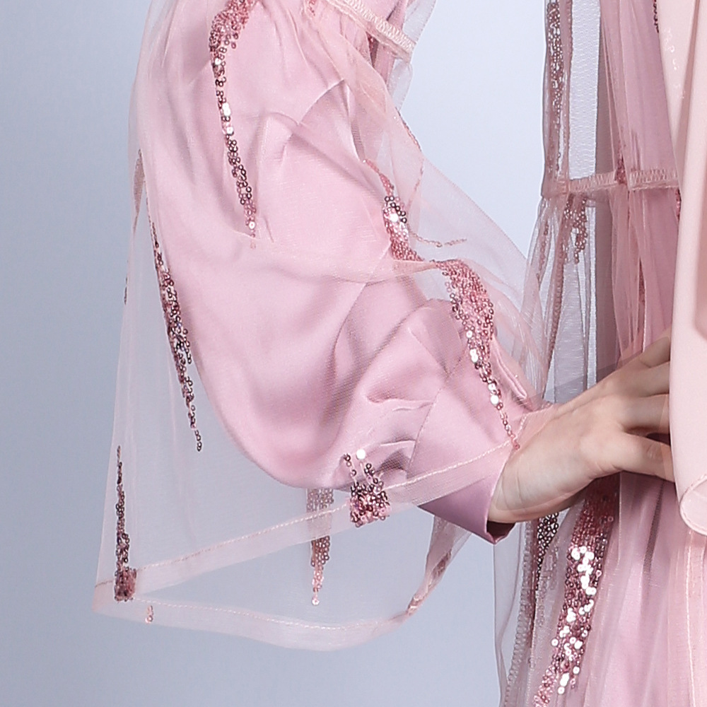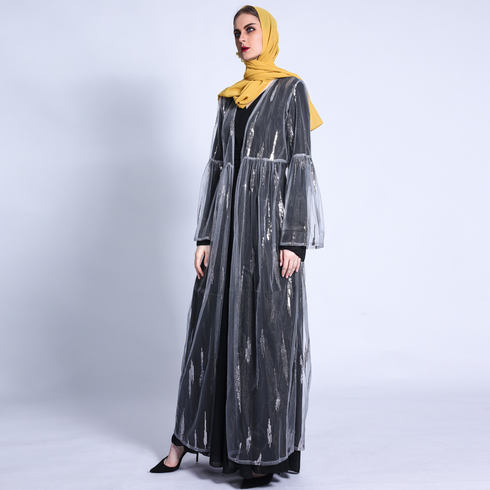 INS Ramadan Fashion Flare Sleeve Lace Up Dress Sequined Mesh Outer Cardigan Female OpenAbaya