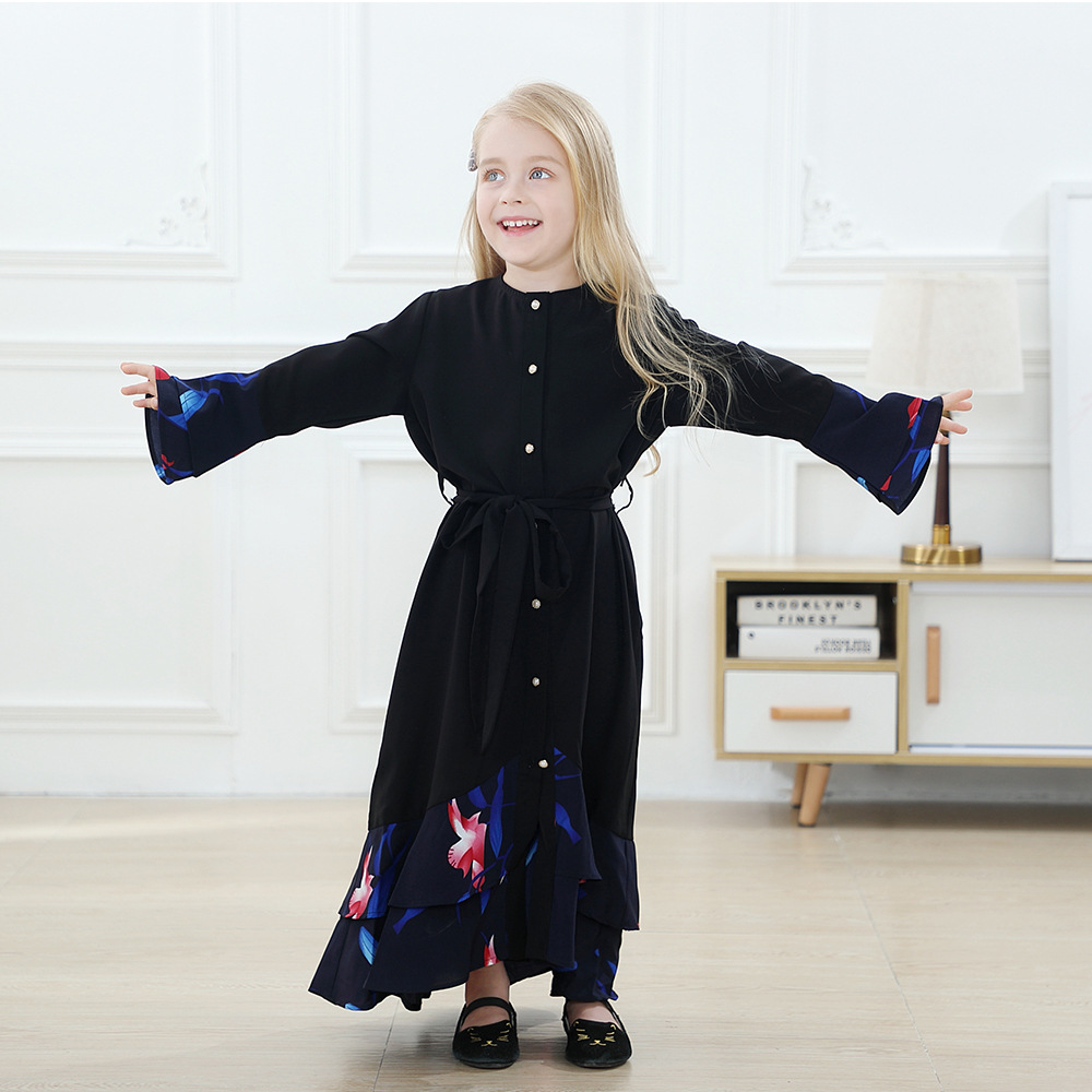 Match Button Flare Sleeve Kid Child Modest Muslim Islamic Abaya Maxi Dress
