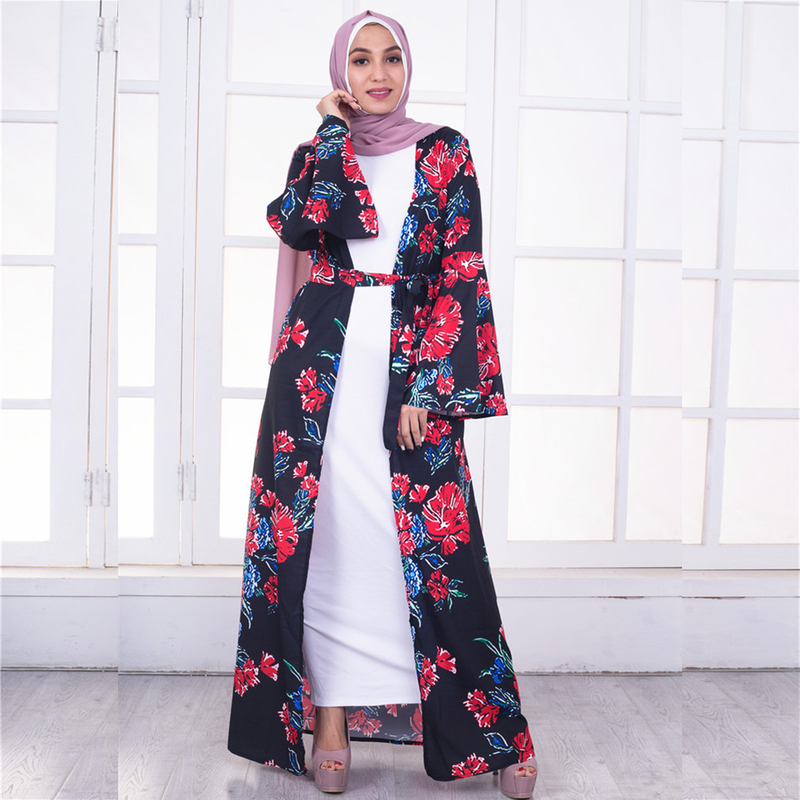 Middle East Islamic Clothing Dubai Oman Muslim Fashion Print Black Cardigan Dresses