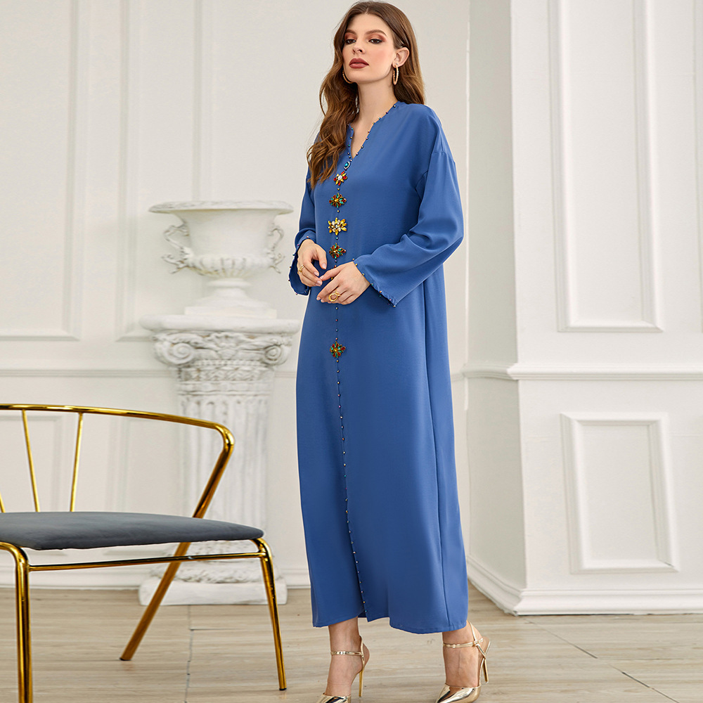 2022 new fashion Muslim lapel solid color full button slim dress long skirt