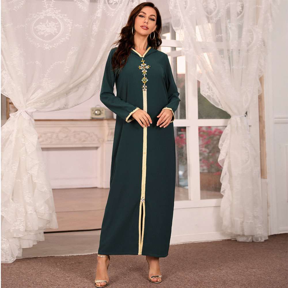 The skirt design adopts an A-line skirt, with a V-neck and regular long sleeves, showing a elegant and commuting style. The loose waist design makes it more comfortable to wear, while the clever combination of hand-stitched diamond craftsmanship and popular element beading adds a delicate highlight to the overall look. The main fabric is made of more than 95% polyester (polyester fiber), which ensures comfort while being durable and easy to care for. Multiple color options of burgundy, dark green and light green. This is a stylish and comfortable commuter style that will become a must-have in your wardrobe.