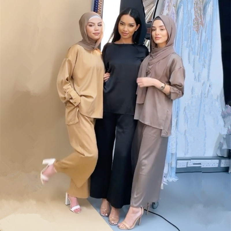Pants Solid Color Women Dubai Maxi Thobe Prayer Burka Islamic Clothing Modest Top Suit 2pieces Kurti 2022 Two Piece Muslim Blouse Set