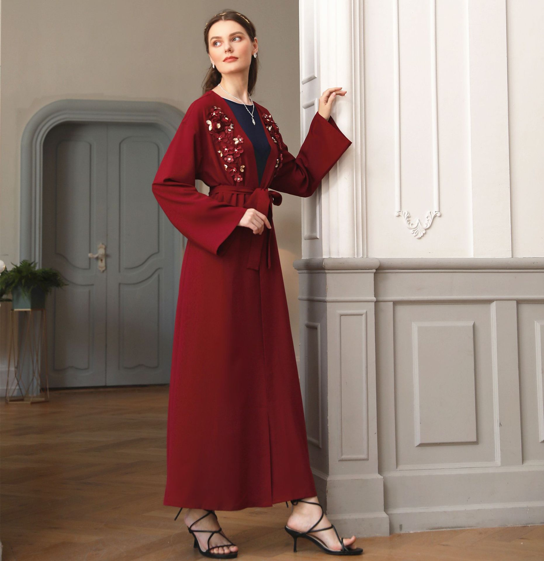 Modest Fashion Dark Red Best Selling Islamic Muslim Robe Maxi Dresses Loose Open Abaya
