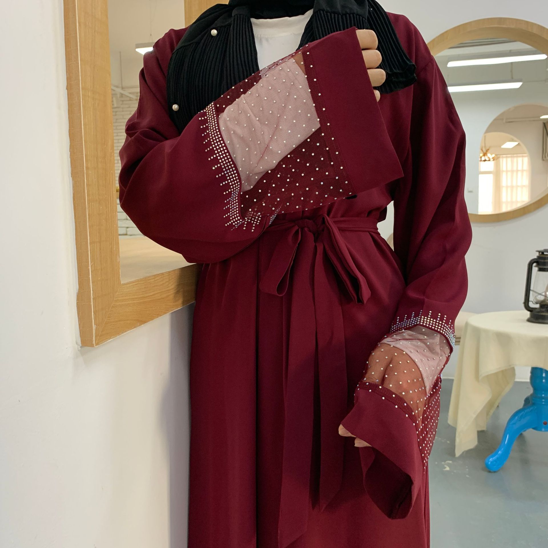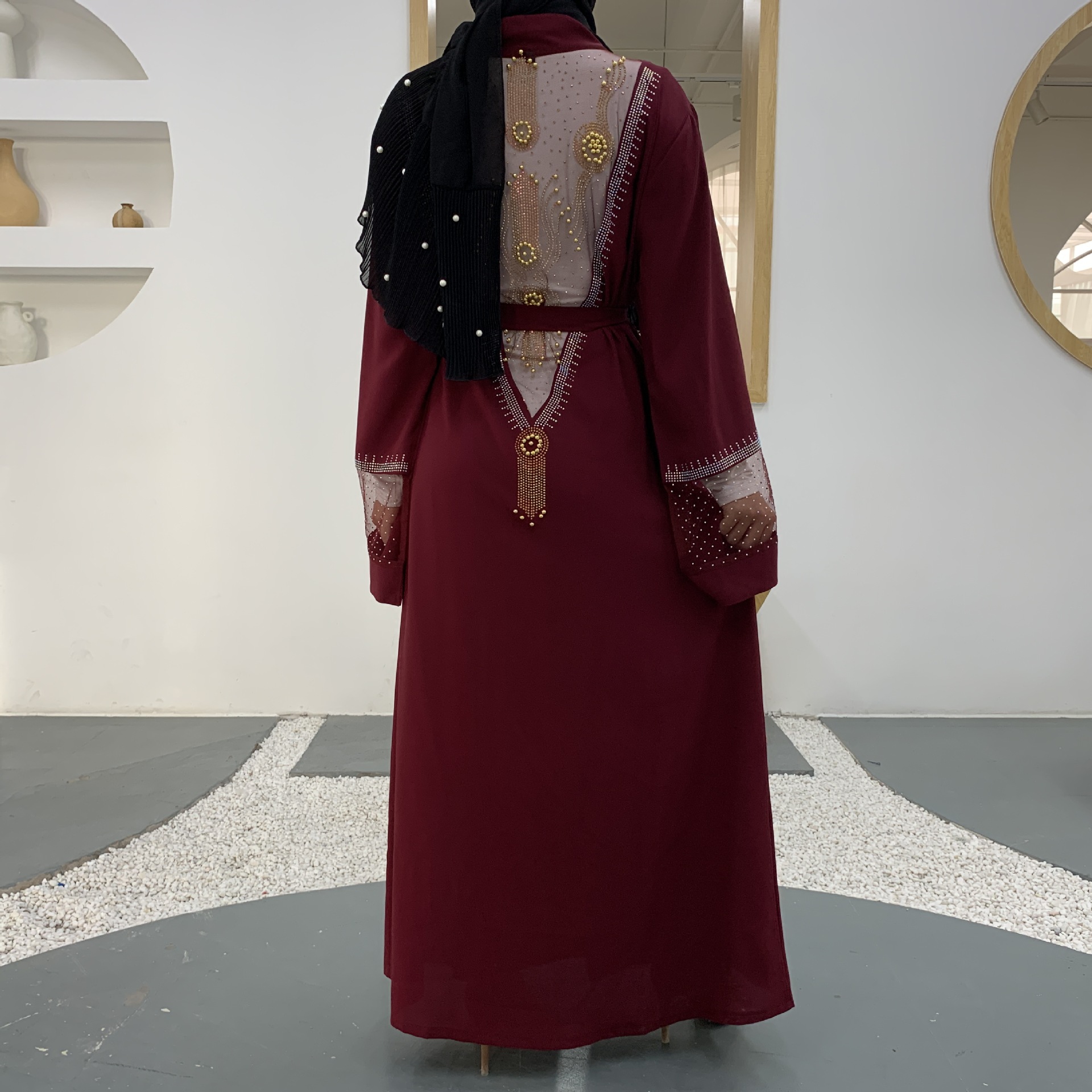 Modest Women's Mesh Fabric Stitching Beading Muslim Cardigan Open Abaya