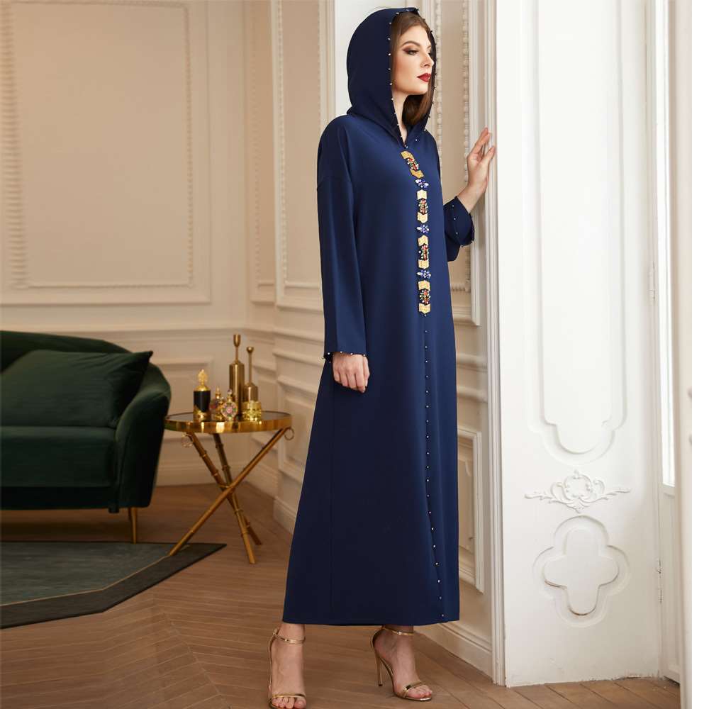 You are here:Home » Products » Abaya / Maxi Dress » Navy Blue Gold Tube Moroccan Style Middle Eastern Hand-sewn Diamond Robe Abaya Muslim Women's Clothing