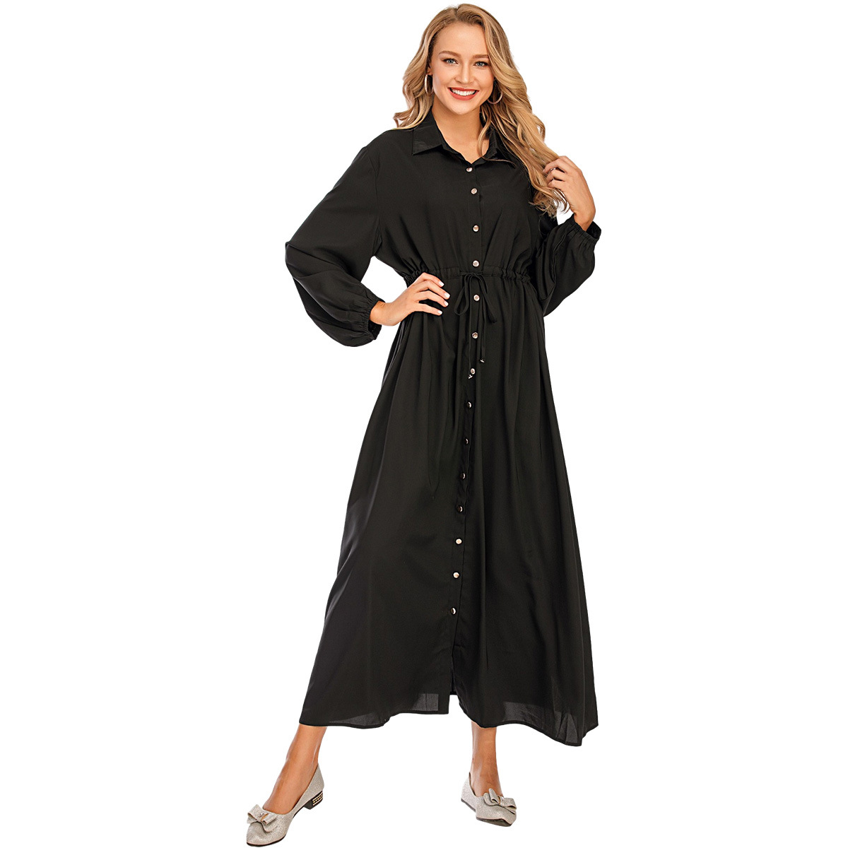 You are here:Home » Products » Abaya / Maxi Dress » New Fashion Muslim Lapel Solid Color Full Button Slim Dress Long Skirt