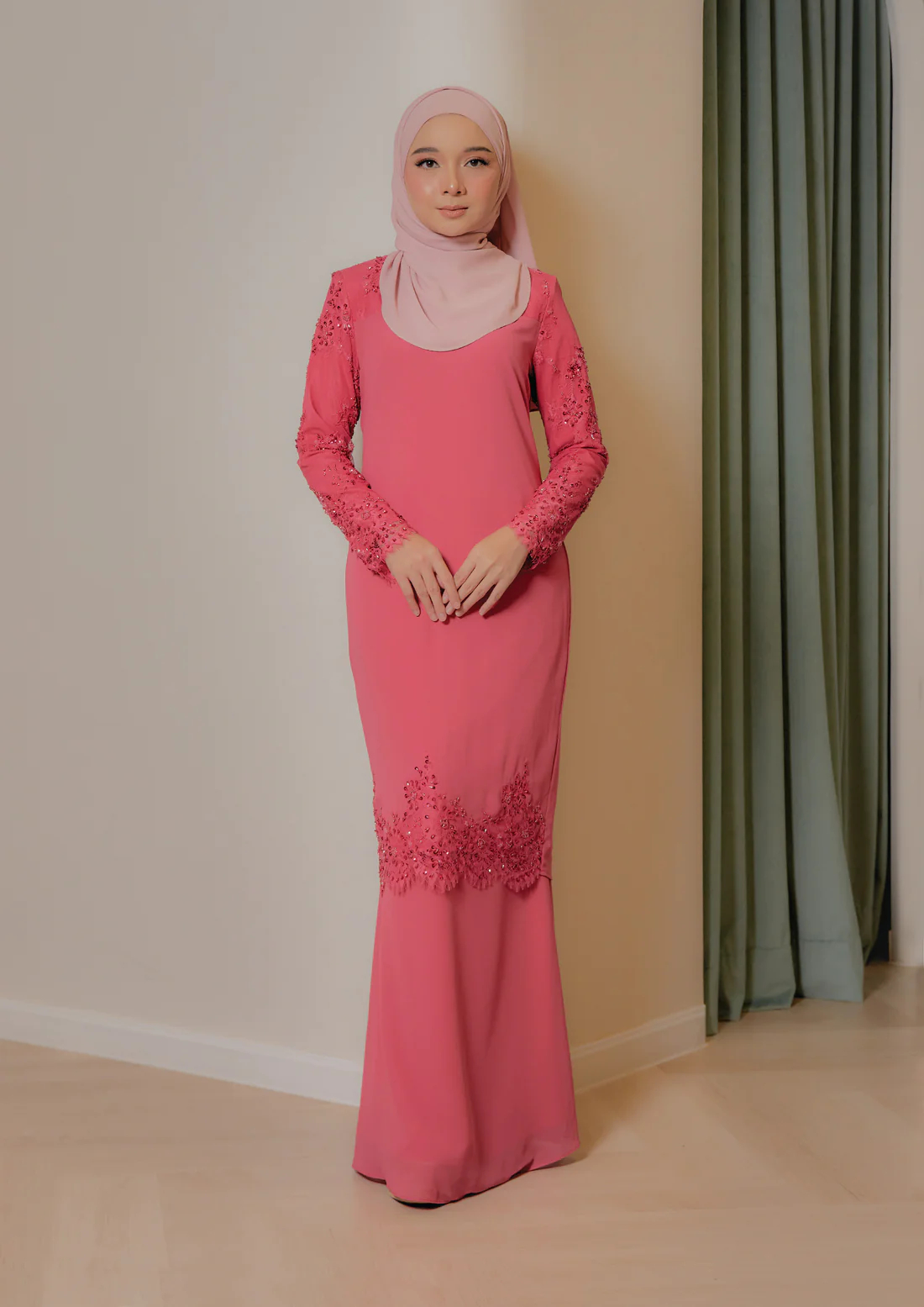One of the standout features of our Baju Kurung Modern Cutting is the full beaded lace sleeves. These exquisite lace sleeves are delicately adorned with intricate beadwork, adding a touch of glamour and sophistication to the ensemble. The beaded lace sleeves make a bold statement and are sure to turn heads wherever you go.