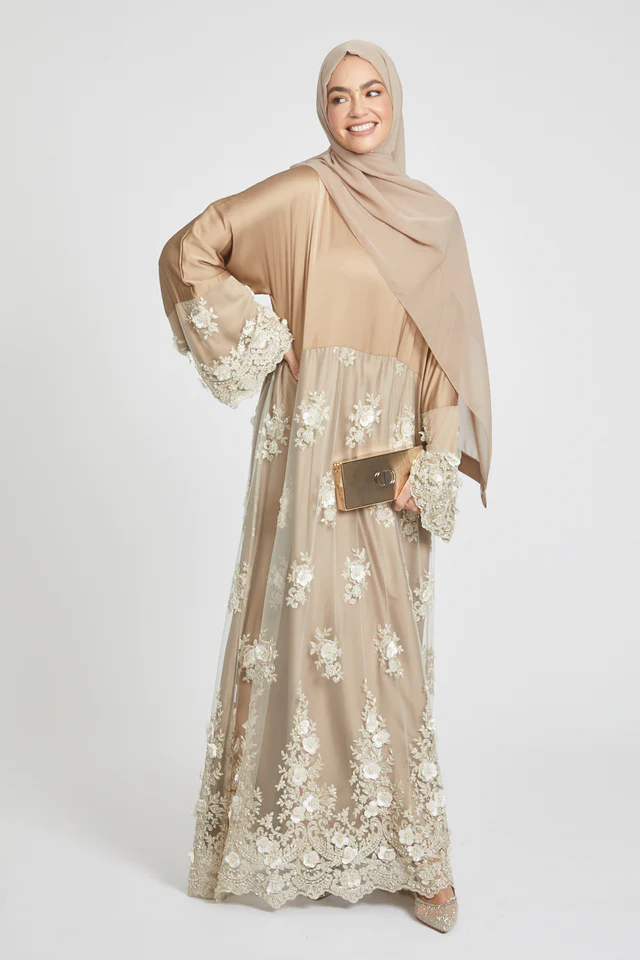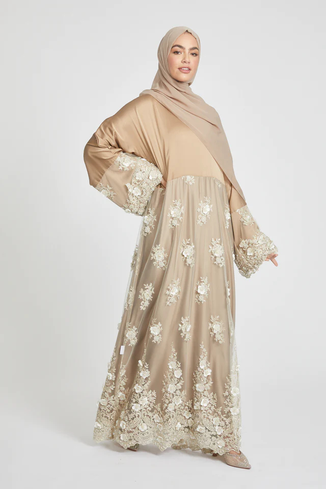 Crafted with utmost precision and attention to detail, this closed abaya is made from luxurious royal satin fabric that drapes beautifully. The champagne gold color adds a touch of sophistication, while the intricate lace detailing and shimmering diamante and embellishments elevate the overall design.
