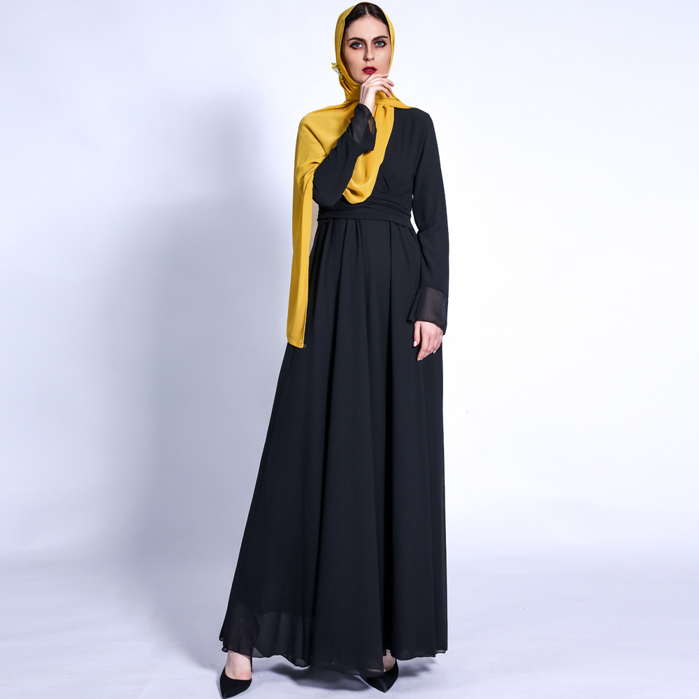 New V-neck long-sleeved dress with chiffon pure color temperament at the waist Muslim women's dress.
