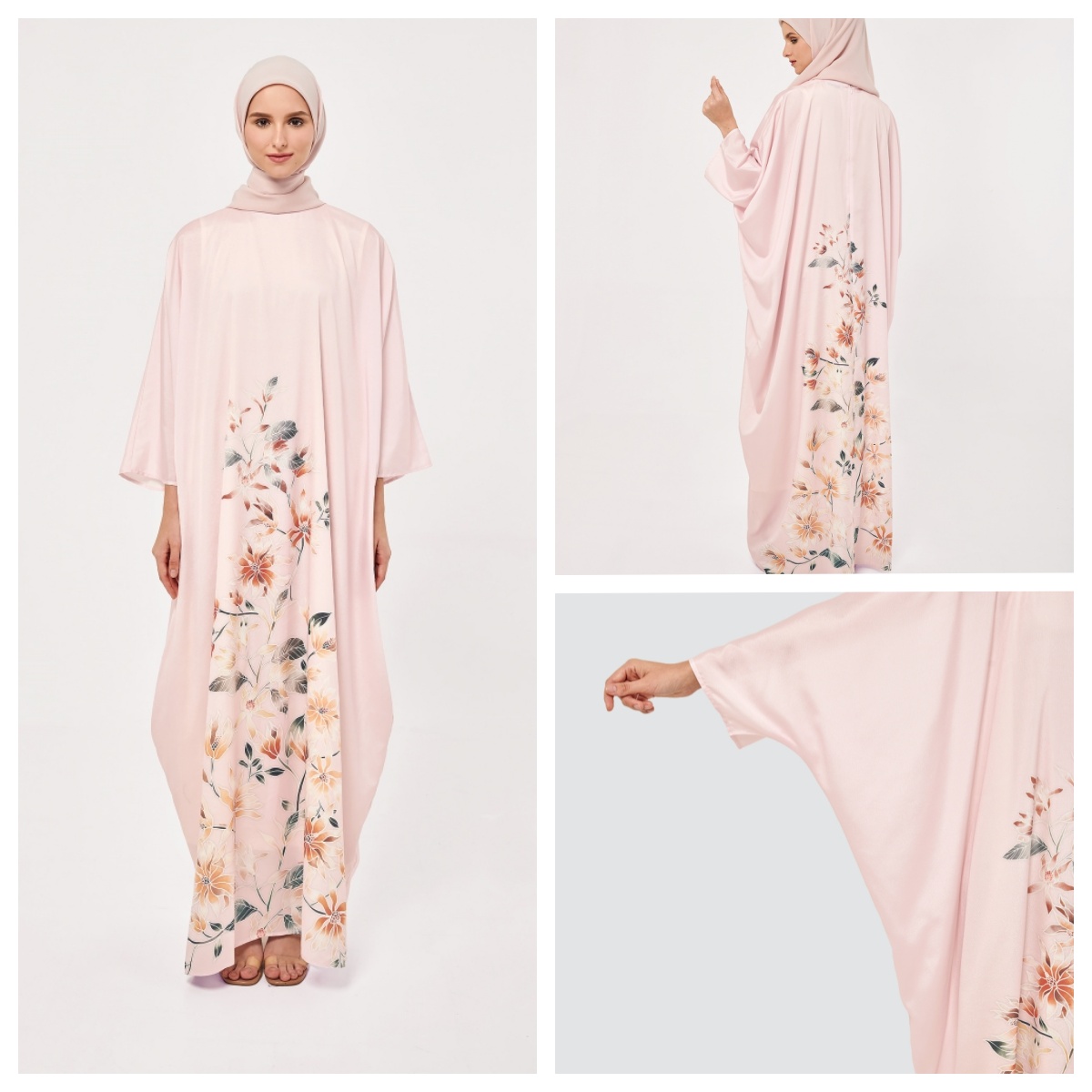 The kaftan dress is designed with a self-fabric belt that is attached on the inside, giving you the option of tying it around your waist for a snatched look or embracing the oversized, loose fit. To tie the Merdeka look altogether, a minimal scattering of Kenanga and Cempaka flowers is cleverly placed on the kaftan dress to tie the Merdeka look altogether.