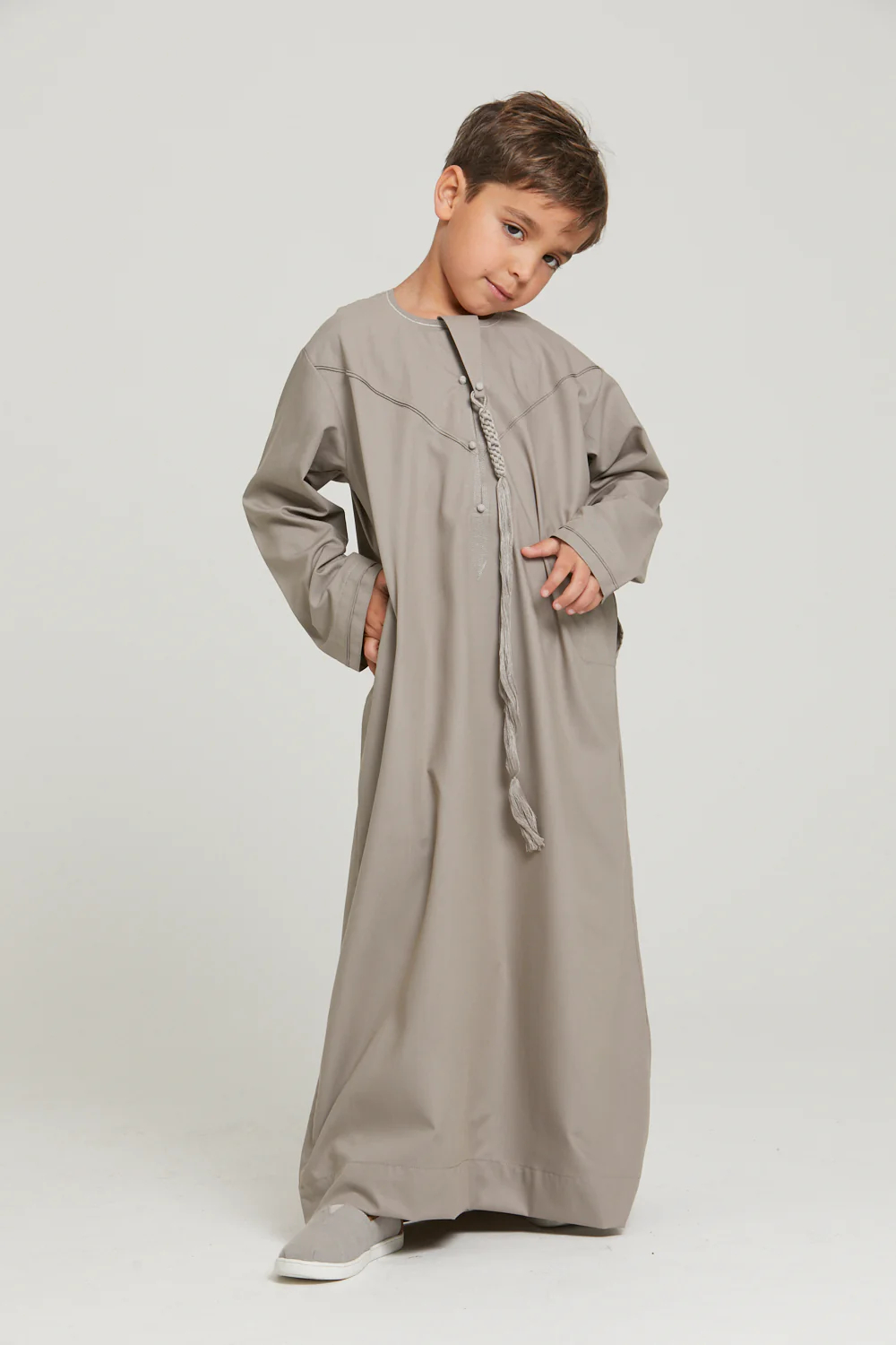 Whether it's for a special event or everyday wear, our Thobe Casual Wear O Neck Premium Kids Long Sleeve Robes Muslim Clothing in Grey Dyed Custom Closure is the perfect choice. Order now and let your kids make a stylish statement with this trendy and comfortable robe.