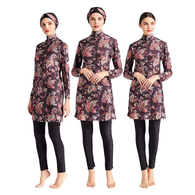 Middle Eastern Women's Printed Swimsuit Beachwear Three-Piece Set with Hood